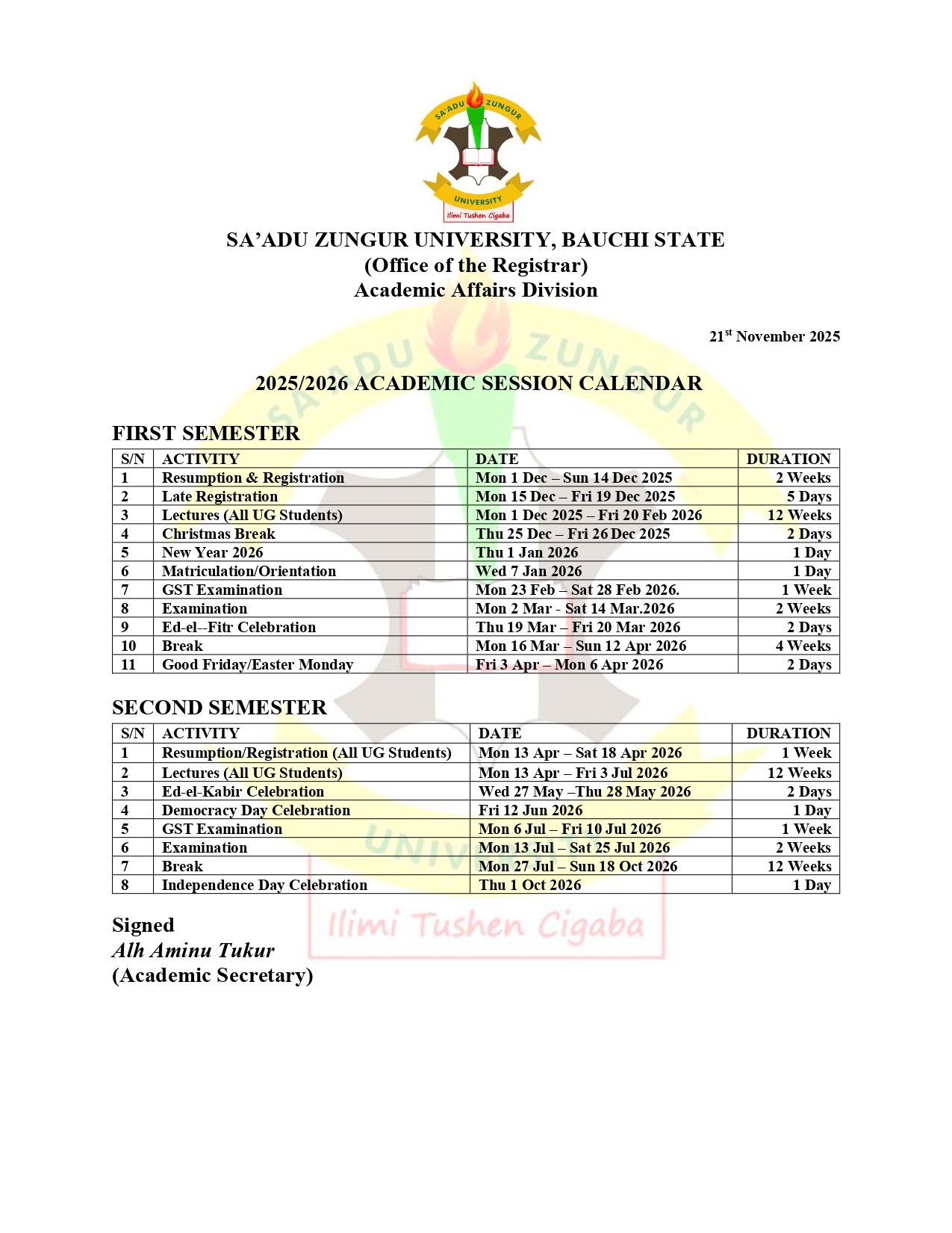 INVITATION FOR PHYSICAL SCREENING (THIRD BATCH) FOR UNDERGRADUATE ADMISSIONS INTO 2025/2026 ACADEMIC SESSION 12/10/2025 INVITATION FOR PHYSICAL SCREENING (THIRD BATCH) FOR UNDERGRADUATE ADMISSIONS INTO 2025/2026 ACADEMIC SESSION Read More »Admissions General Notice student affairs Uncategorized